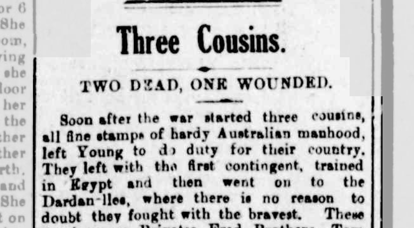 Soon after the war started three cousins, all fine stamps of hardy Australian manhood, left Young to do duty for their country. They left with the first contingent, trained in Egypt and then went on to the Dardanelles, where there is no reason to doubt they fought with the bravest. These cousins were Privates Fred Prothero, Tom Debnam and W. McCarthy, all natives of Young. We very much regret to say that two of these young men now fill heroes graves on foreign soil, but their names are not last on the scroll of fame, for they are amongst those who made Australia and her noble sons which will last throughout the ages after peace is restored.