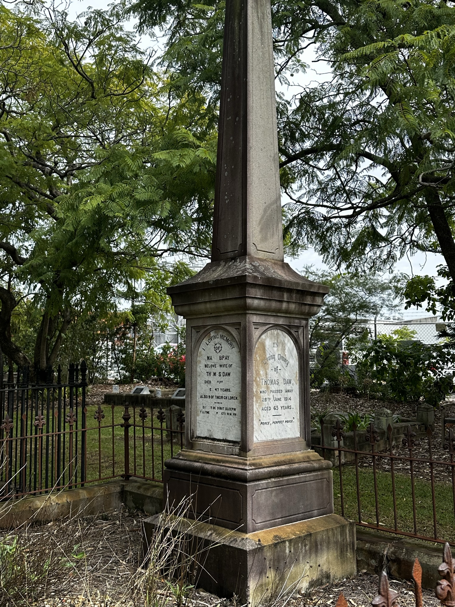 Within the grounds are the graves of many pioneers of Brisbane’s eastern suburbs. There are single graves and family plots. Towards the back corner is a plot surrounded by an ornate iron fence. The memorial is a tall spire of sandstone. The front facing panel acknowledges the death of Mary, beloved wife of Thomas Daw, died 1 Nov 1892, aged 47 years. Also 9 of their children.