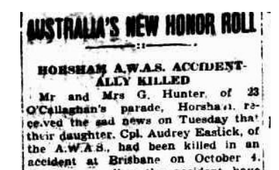 Corporal Audrey Agnes Eastick of the Australian Women’s Army Services was stationed in Brisbane and working as a clerk at Australian Headquarters during World War 2. She grew up in Victoria in Horsham and at the time of her enlistment was 29 and married to Vivian Eastick, who was stationed with the Air Force in Townsville.