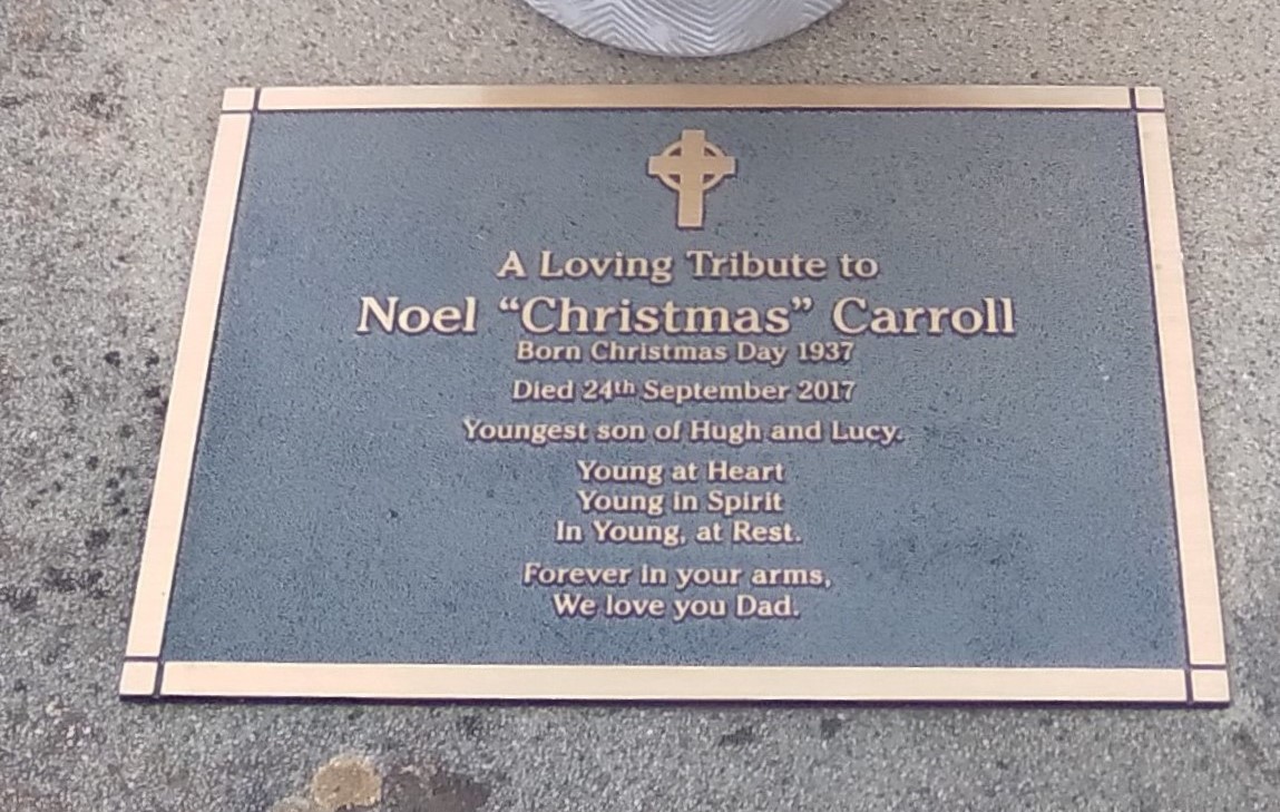 It is the grave of Noel “Christmas” Carroll born on Christmas day 1937, to Hugh and Lucy. What else would you call your son born on Christmas day when your last name is Carroll? And what other nickname would an Australian be given with the name Noel Carroll, than ‘Christmas’. A nickname he obviously embraced as evident from it being included on the plaque on his grave.