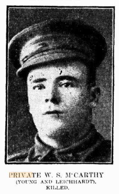 William McCarthy was featured with his cousin Thomas Debnam in an article in the Sydney Morning Herald of 23 August 1915. The article was headlined ‘Men of the Dardanelles’. Twenty photos display the faces of lives lost or injured in the Gallipoli campaign. It included their names and places of birth.